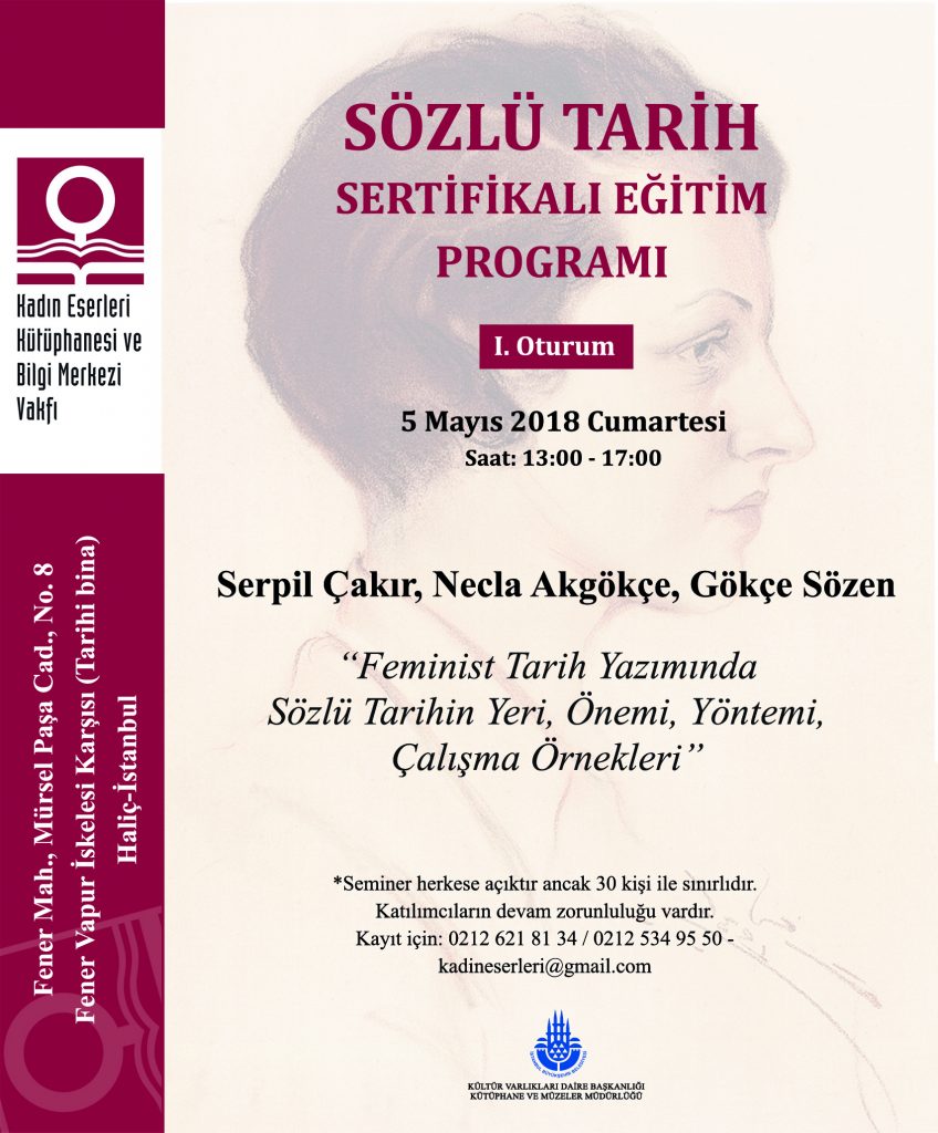 Temel amacı sözlü tarih yöntemini feminist söylemle ele almak, anlatmak, alanda çalışacak araştırmacılara yol göstermek, sözlü tarih çalışmalarının yaygınlaşmasını sağlamak olan ve 5-27 Mayıs 2018 tarihleri arasında düzenlenen “Sözlü Tarih Sertifikalı Eğitim Programı”nın 1. Oturumu, 5 Mayıs 2018 Cumartesi günü yapıldı. “Feminist Tarih Yazımında Sözlü Tarihin Yeri, Önemi, Yöntemi, Çalışma Örnekleri” başlıklı bu oturumun konuşmacıları, sözlü tarih alanında deneyimlerini ve çalışmalarını paylaşmak üzere gönüllü olarak programa katılan hocamız Serpil Çakır, araştırmacılar Necla Akgökçe ve Gökçe Sözen’di. Programın bir diğer gönüllü hocası Birsen Talay Keşoğlu, bu eğitim programı sonrası yazdığı makalede 1. oturumun içeriğini şu şekilde özetliyor: