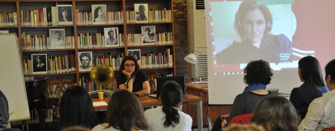 “Beşinci ve son oturumda Funda Şenol Cantek ve Elif Ekin Akşit sunumlarını yaptılar. Akşit’in Ankara’dan video konferansla katıldığı oturumda Cantek ve Akşit, sözlü tarih çalışmaları ile ilgili deneyimlerini ve yaptıkları çalışmanın detaylarını aktardı. Dört yıl önce Elif Akşit ile birlikte yaptıkları, Ankara Üniversitesi BAP projesi olan ‘Kadınlardan Öğrenmek: Kadınların Sınıflar ve Kültürlerarası Bilgi Aktarımı’ projesinin bir özetini sundular. Bu çalışmadan yola çıkarak, ‘feminist metodoloji doğrultusunda mülakat, sözlü tarih görüşmesi, odak grup görüşmesi ve katılımlı gözlem nasıl yapılır, etik sorunlar nelerdir’ gibi soruların yanıtlarını öğrencilerle birlikte nasıl aradıklarını aktardılar.