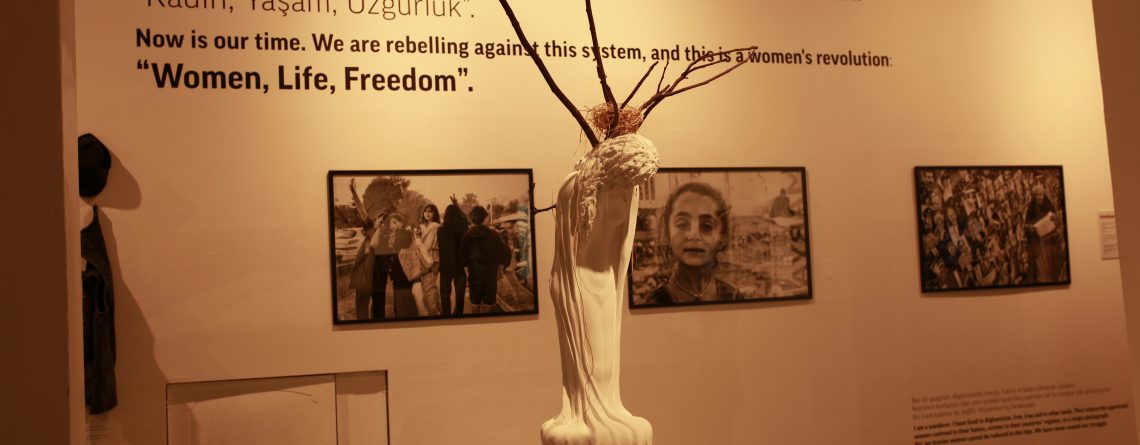 MARYAM: Maryam Mazrooei İranlı, gazeteci ve fotoğrafçı. Birçok ülkeye seyahat etmiş; Türkiye, Ürdün, Suudi Arabistan. 2022’de Mahsa Amini direnişinin sloganı olan “Kadın, yaşam, özgürlük” belli ki onu çok etkilemiş. Resme de başlamış. Kalabalıkların enerjisi tablolardan dışarı taşıyor. Hele bir de yeni yetme kız resmi var ki, yüzünde yeni yetmeye yakışmayan durgun bir anlatım; kim bilir ne sırlar saklıyor bu hüzünlü bakışlar? Beyaz giysiler içinde, utanmış gibi önüne bakan zarif genç kadın heykeli, dallar arasında kurulmuş kuş yuvasının sırtındaki ağırlığı altında ezilmiş besbelli. (“Yuvayı yapan dişi kuş” o.) Maryam’ın panosundaki fotoğraflar arasından kadın gazetecilerle çektirilmiş toplu fotoğraf dikkat çekiyor. Meryem başı sık sık derde giren politik kimliği nedeniyle ülkesinden ayrılmış, çalışmalarını artık İstanbul’da sürdürüyor.